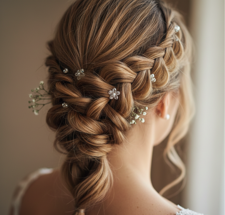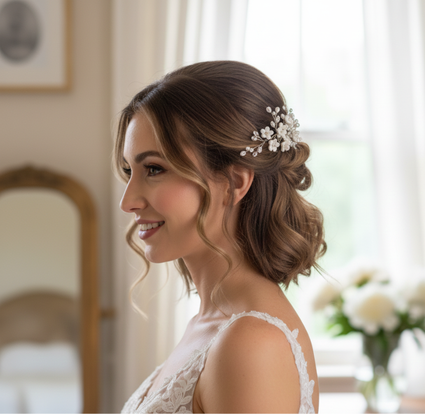 Stile romantico: acconciatura sposa capelli medi e semiraccolti