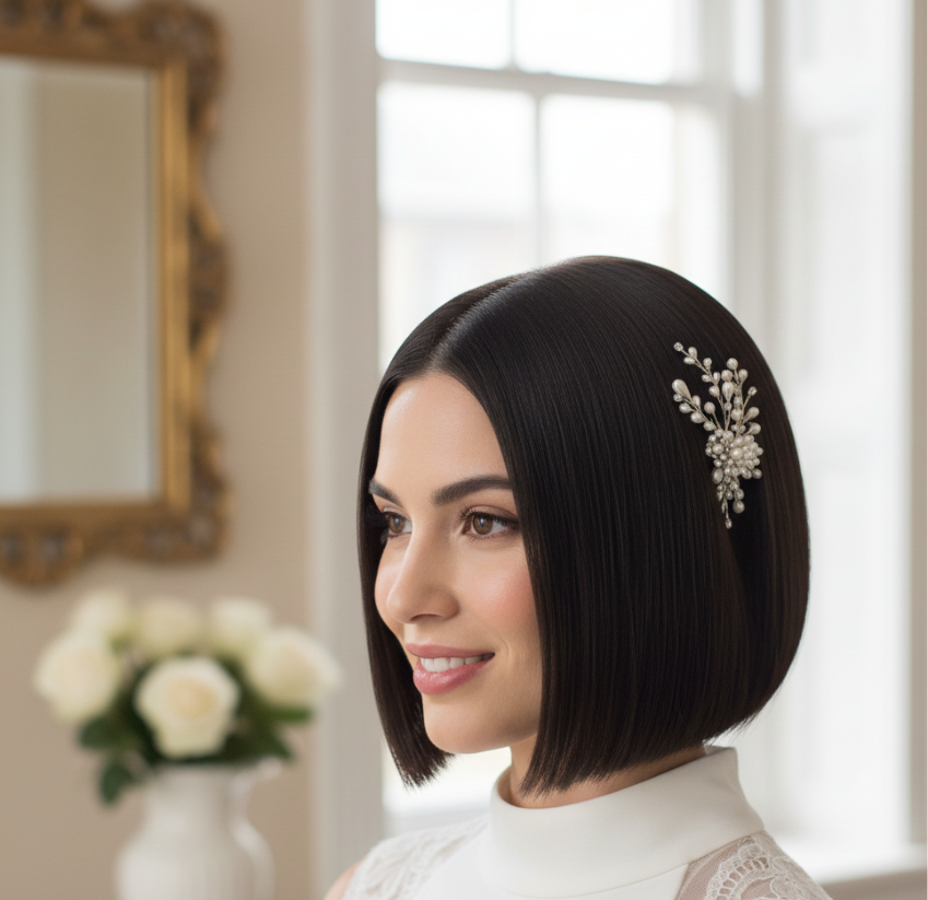 Se hai un taglio dritto e desideri mantenere un look minimal ma di classe, l’opzione sposa caschetto liscio è la più elegante. L’acconciatura è la piega stessa, impeccabile e lucidissima.